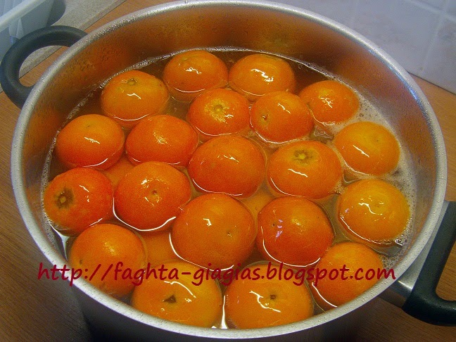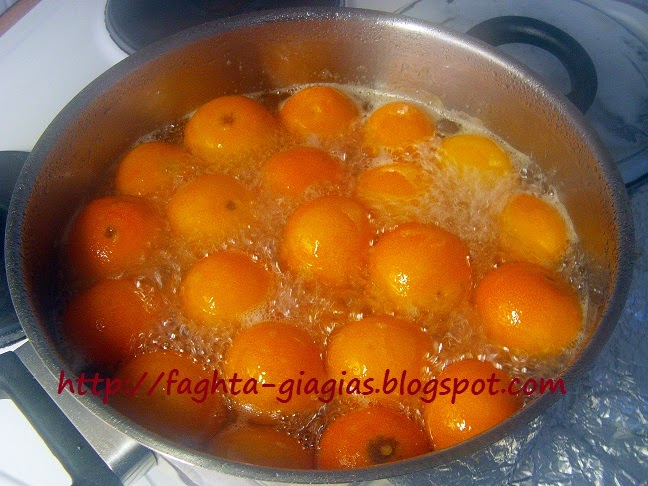 | Πλένουμε τα μανταρίνια και στη συνέχεια, τα βάζουμε σε κατσαρόλα με αρκετό νερό να βράσουν, για να ξεπικρίσουν. | |